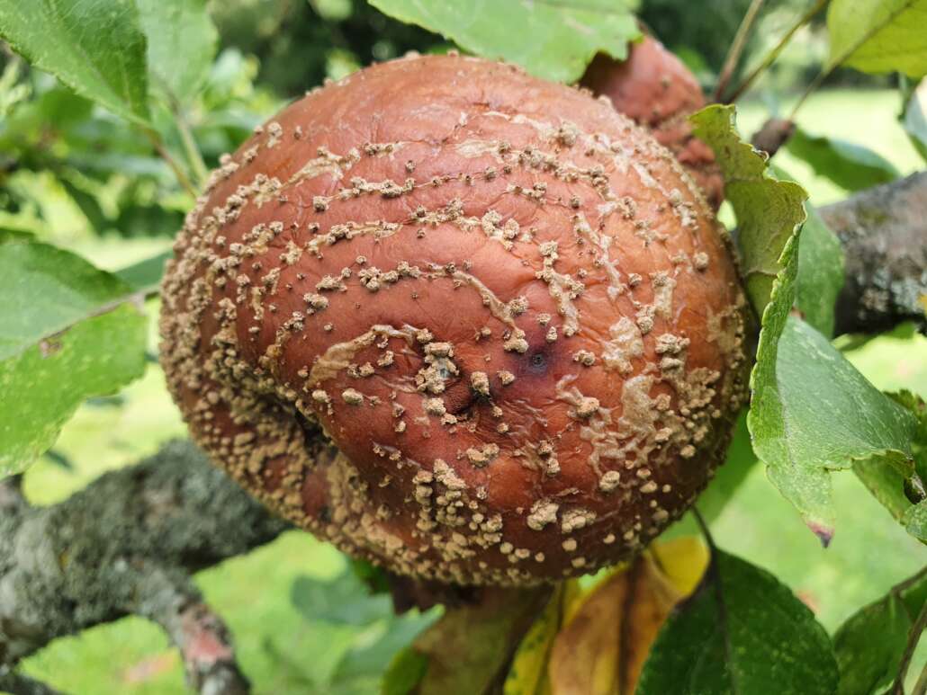 -En été et en automne : la pourriture des fruits, c’est l’étape la plus visible car les spores pénètrent les fruits. L’infection se fait le plus souvent par une blessure : piqûre d’insecte (le Carpocapse, ver du pommier, est le facteur aggravant). Mais aussi : coup de bec d’oiseau, choc de grêle, ou simplement un point de contact entre deux fruits serrés.